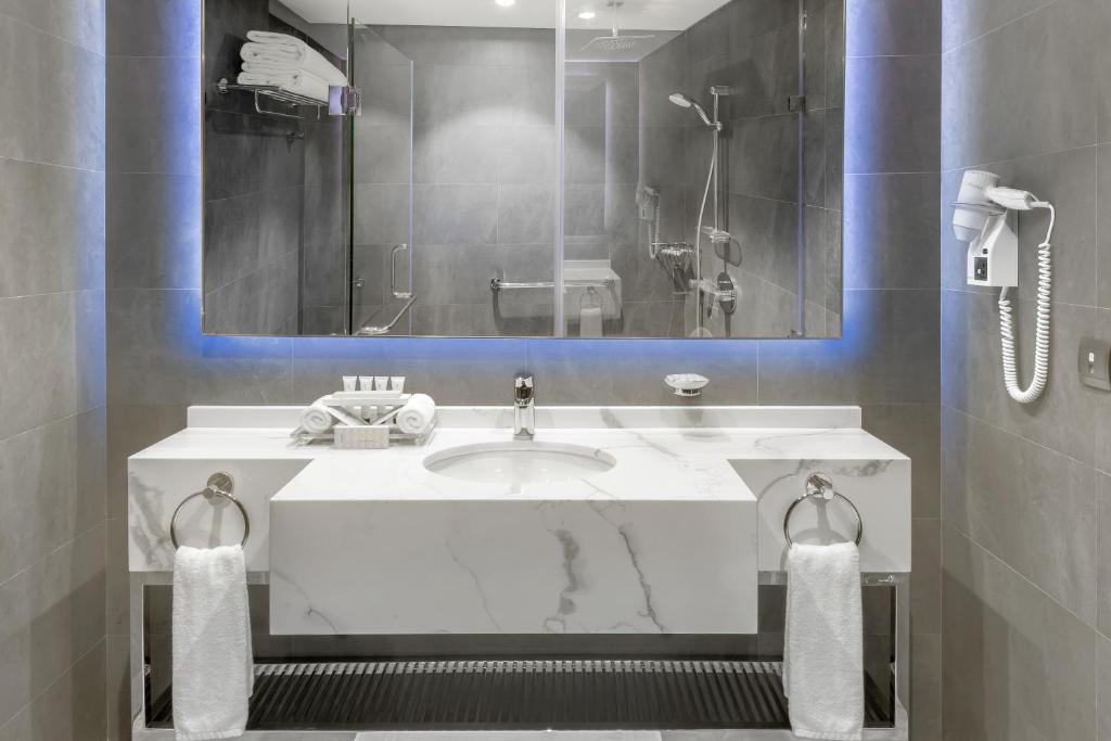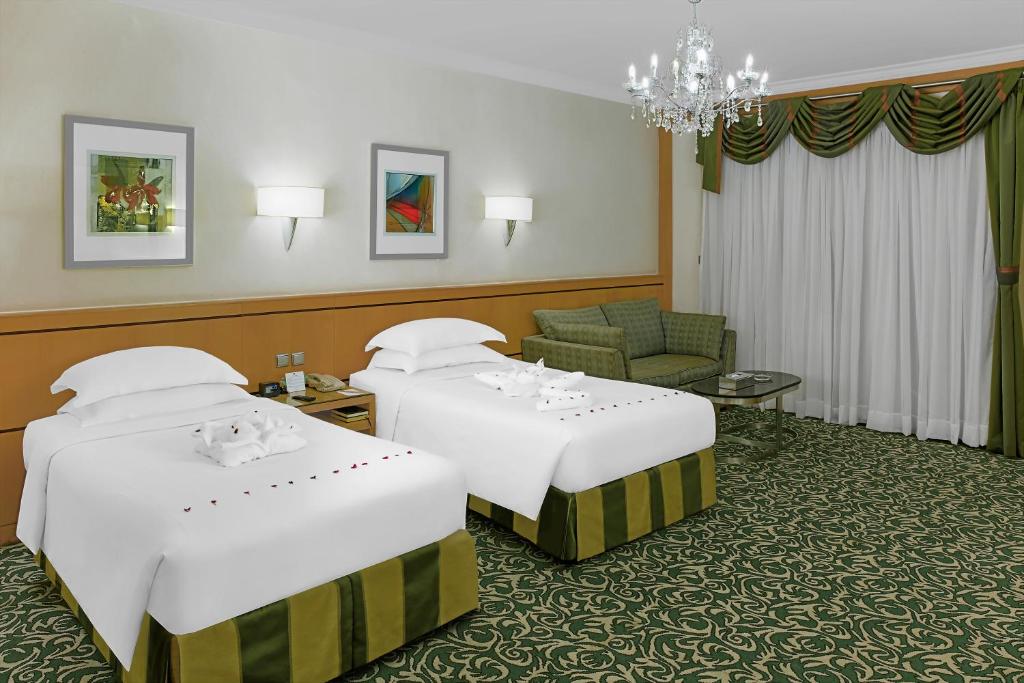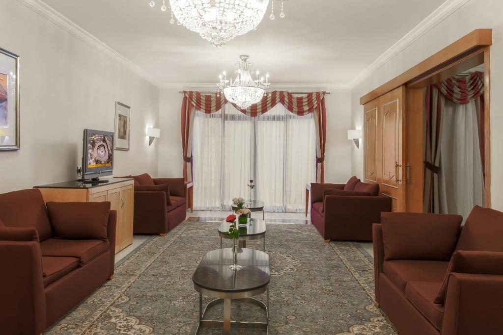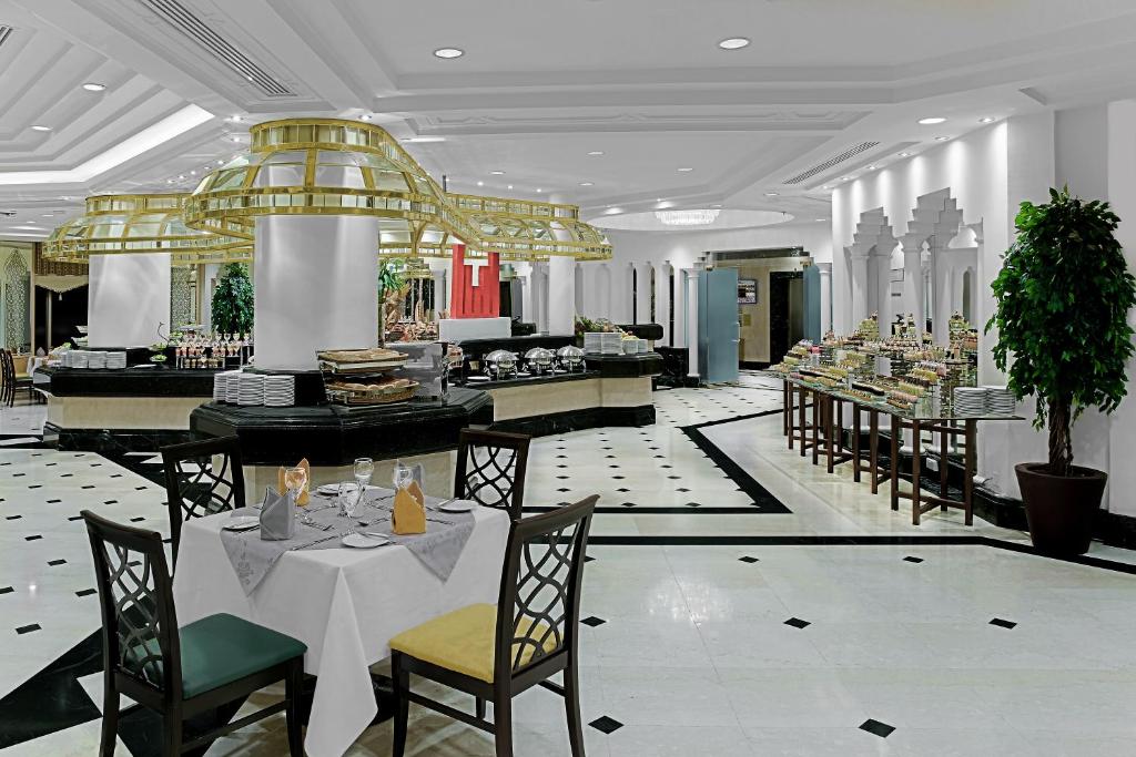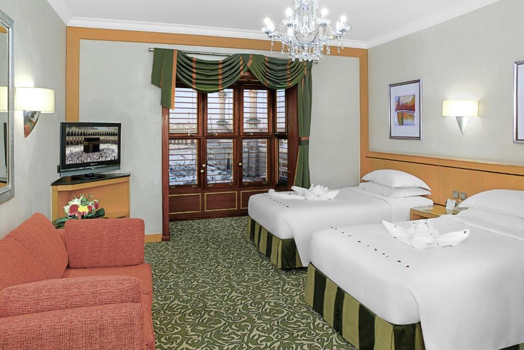 The 5-star Makkah Towers is overlooking the Makkah’s Holy Haram Mosque and the Kaaba. It offers stylish rooms, 7 dining options and a 10,000 seat carpeted prayer hall. Makkah Towers spacious, air-conditioned rooms feature Art Deco-style decor, satellite TV. Kitchenette facilities include a coffee maker, and room service is available throughout the day. . Jasmin Caffe specialises in Arabic coffee and fresh-baked pastries. Chinese and Arabic restaurants are also on site. Staff at Makkah Towers 24-hour front desk can arrange currency exchange or car hire. A full-service business centre with fax and photocopying facilities is also available. Guests can enjoy relaxing foot massages at the Reflexology Health Centre. A shopping mall with over 450 shops is connected to the Makkah Towers. King Abdulaziz International Airport is approximately one hours’ drive away.