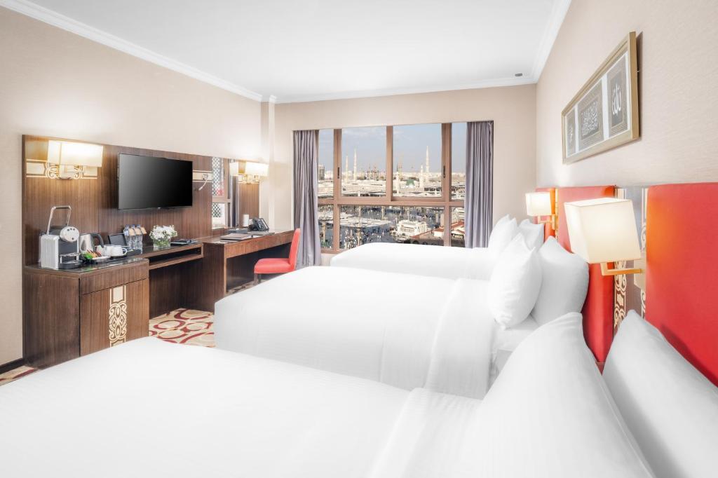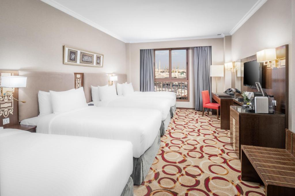 Comfortable Accommodations: Millennium Taiba Hotel in Al Madinah offers family rooms with air-conditioning, private bathrooms, and city views. Each room includes a work desk, TV, and free toiletries. Dining Experience: Guests can enjoy international cuisine at the family-friendly restaurant, featuring a traditional and modern ambience. Breakfast options include continental, American, buffet, and halal. Facilities and Services: The hotel provides a fitness centre, free WiFi, paid shuttle service, and a 24-hour front desk. Additional amenities include a business area, bicycle parking, and free on-site private parking. Prime Location: Located 15 km from Prince Mohammad bin Abdulaziz International Airport, the hotel is an 8-minute walk from Al-Masjid an-Nabawi. Nearby attractions include Qiblatain Mosque and Mount Uhud.