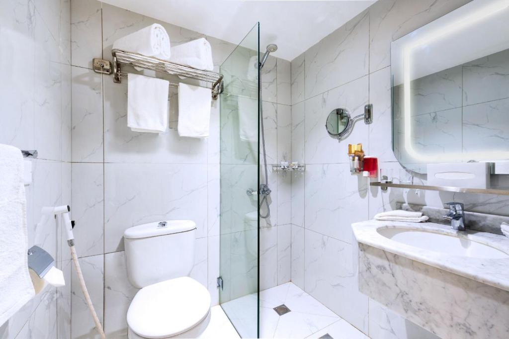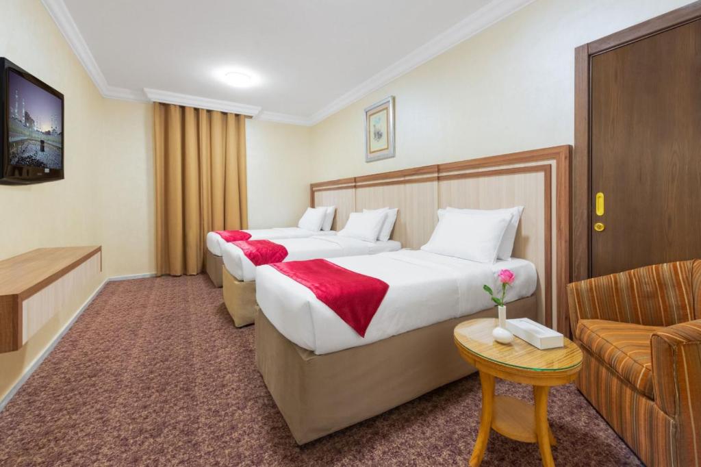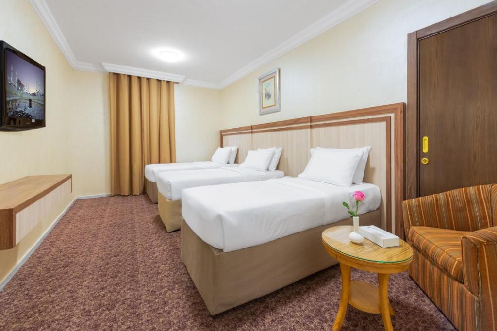 Palestine Makkah Hotel is located on Ibrahim El Khalil Street, just 800 meters from the holy mosque. Palestine Hotel features a modern and attractive architectural design whereby all the 15 floors exterior are decorated with marble and light-resistant gold glass. Palestine Hotel offers 445 rooms and suites. All rooms are equipped with flat screen TV, satellite channels, air conditioning, mini fridge and internet access. Palestine Hotel offers to its guest’s two restaurants on the ground and first floor where meals are served at a buffet style. Guests can choose their favorite dishes from the room service menu. The Palestine Hotel features two banquet halls for up to 500 people, offering a variety of packages including many options and parking services.